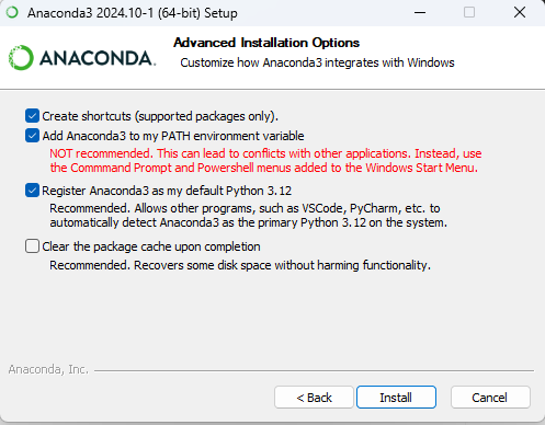 위 옵션을 설정하지 않을 경우 시스템 환경 변수 PATH에 ‘anaconda’ 설치 경로를 직접 지정해야한다.